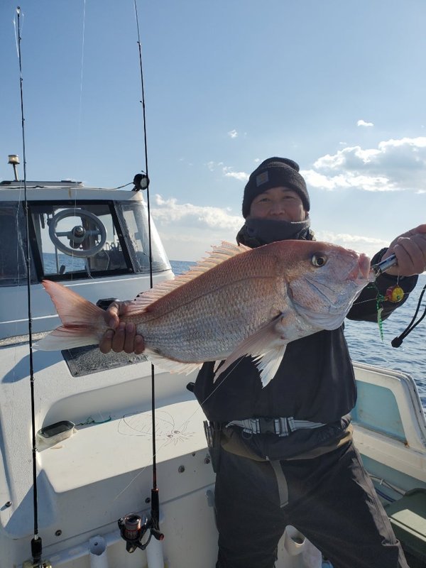 朝からムフッ地獄、潮流れやん地獄。久しぶりの真鯛67cm。最後にアオリイカ