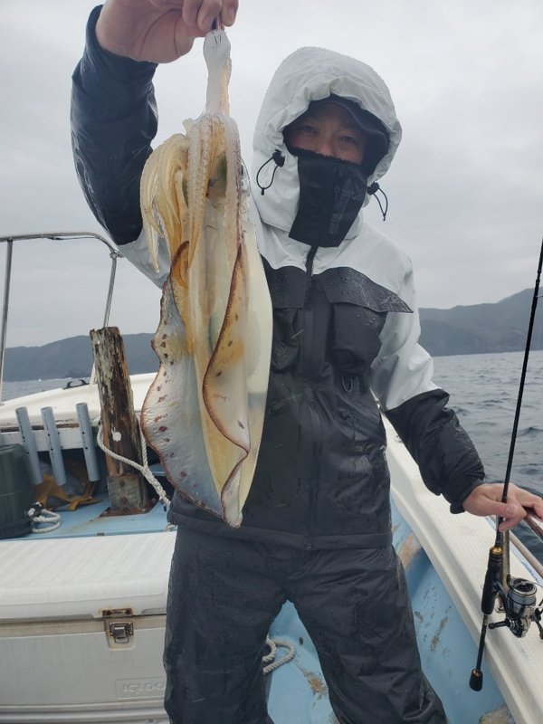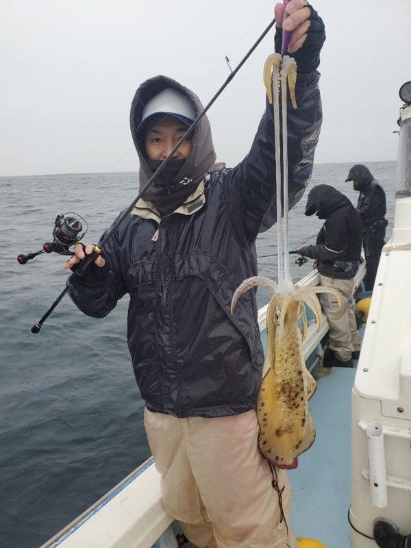 ウネリ残って雨予報。冷たい雨の中頑張って頂きましたが、アオリ3杯、コウイカ1杯。