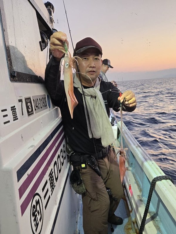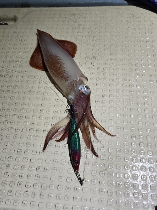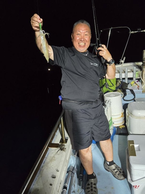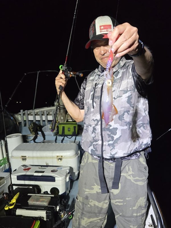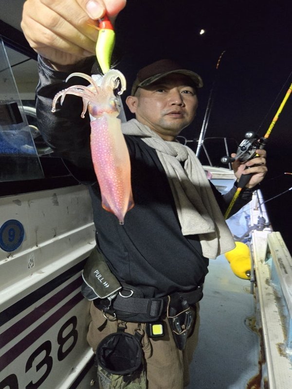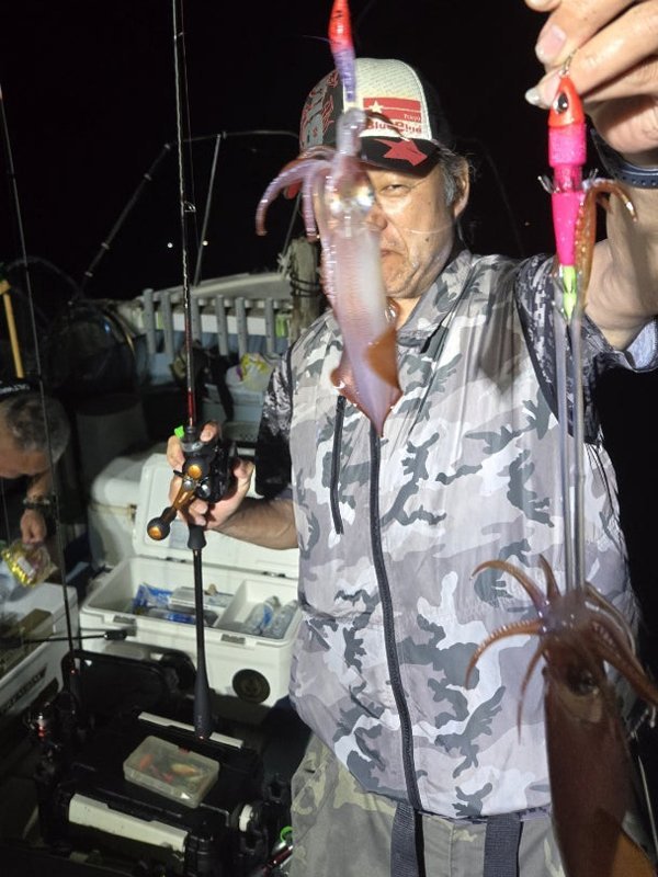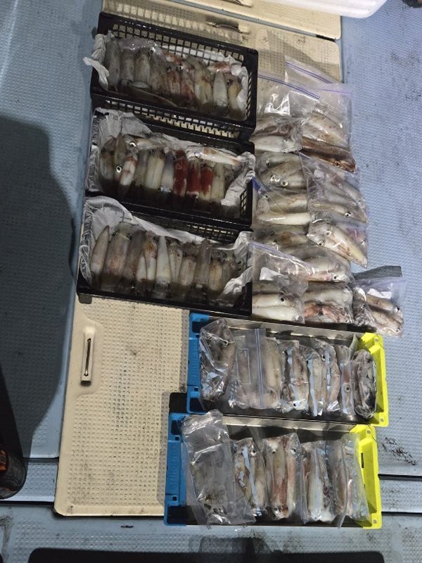 明るいうちはあんまり当たらず。暗くなってから、お客さん3人誰かが釣っている。船中160杯オーバー。
