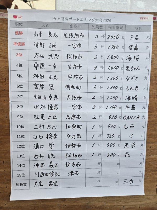 開催も危ぶまれる予報でしたが開催できました。厳しい日でしたがなんとかアオリン頂きましたわ。何よりも、無事に終えることができました。皆様ありがとうございました。