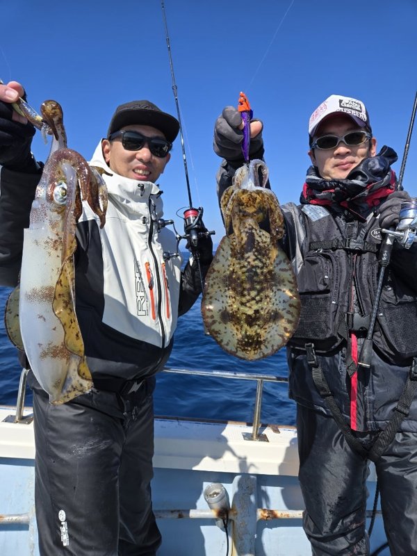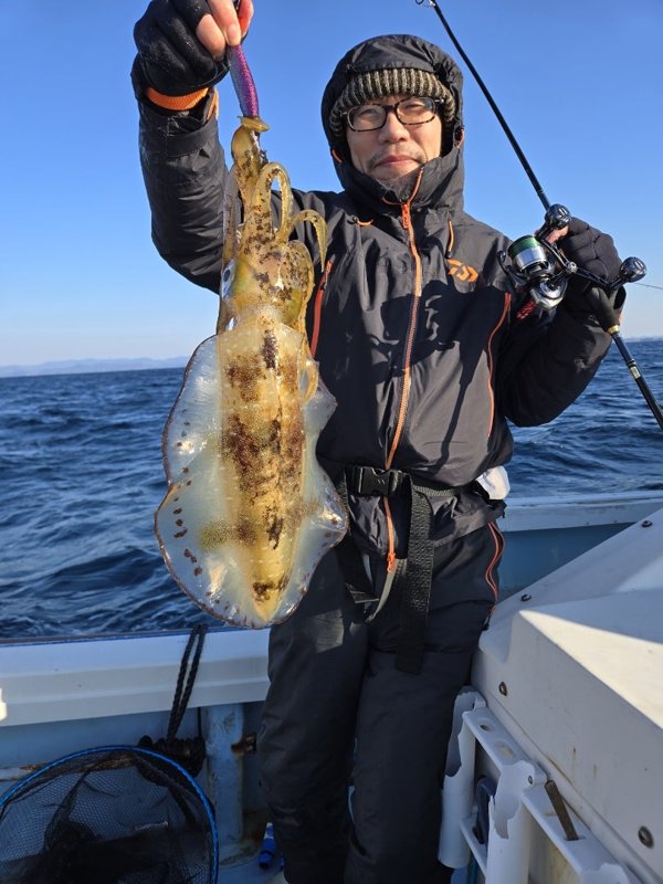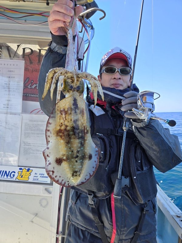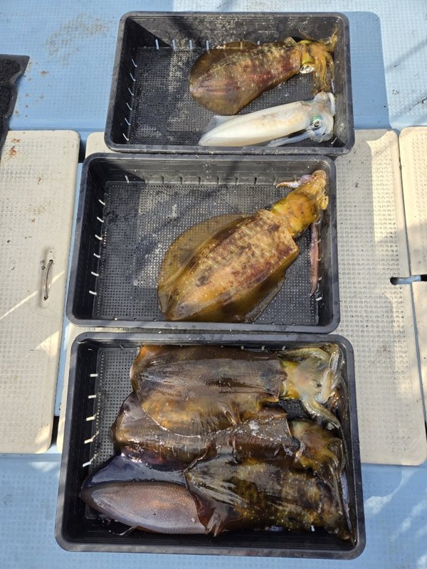 久々の出船。いきなりエギ丸飲みでシオ。その後3連発、ダブル、単発で全員安打のツヌケ。2杯はキロ無、後はすべてキロオーバー。